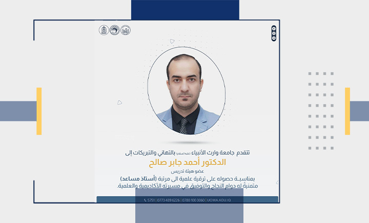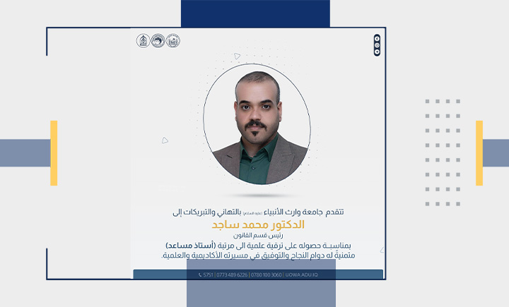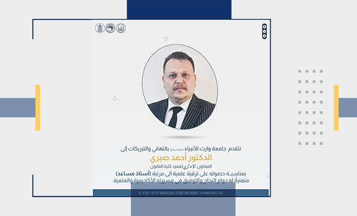 تتقدم رئاسة جامعة وارث الأنبياء (عليه السلام) بالتهنئة إلى الدكتور أحمد صبري، المعاون الإداري لعميد كلية القانون، والدكتور محمد ساجد، رئيس قسم القانون، والدكتور أحمد جابر، أمين مجلس الجامعة، بمناسبة ترقيتهم إلى مرتبة "أستاذ مساعد".