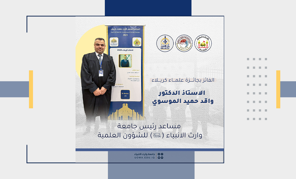 في إنجاز علمي يُضاف إلى رصيد جامعة وارث الأنبياء (عليه السلام)، حصد الأستاذ الدكتور واقد حميد الموسوي، مساعد رئيس الجامعة للشؤون العلمية، المركز الثاني في جائزة (علماء كربلاء)، ضمن فعاليات المؤتمر العلمي الأول الذي أُقيم برعاية محافظ كربلاء المقدسة.