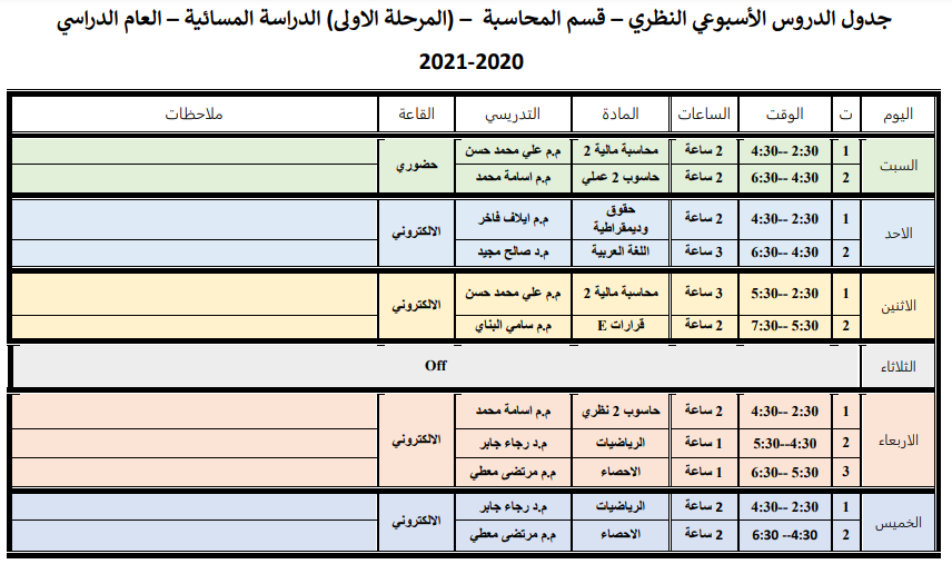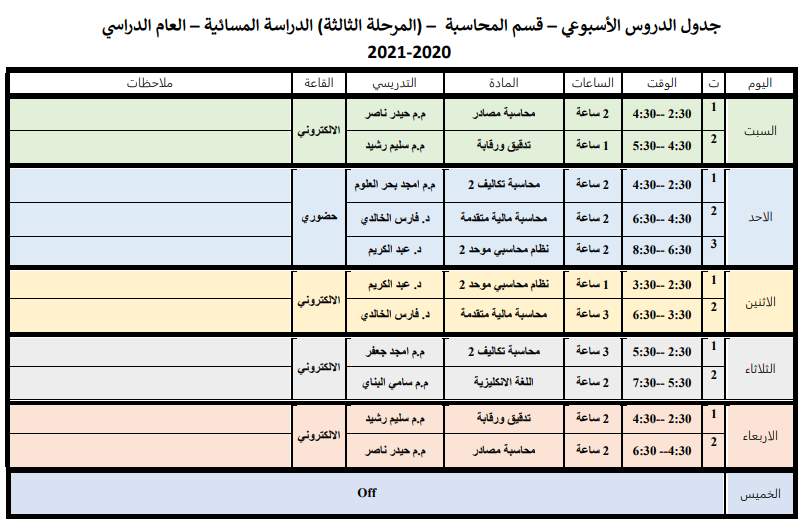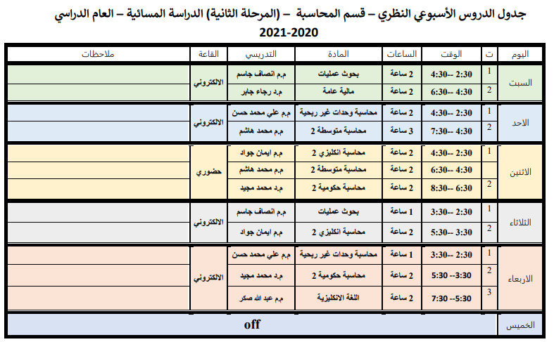 جدول الدروس الاسبوعي للكورس الثاني لقسم المحاسبة الدراسة المسائية