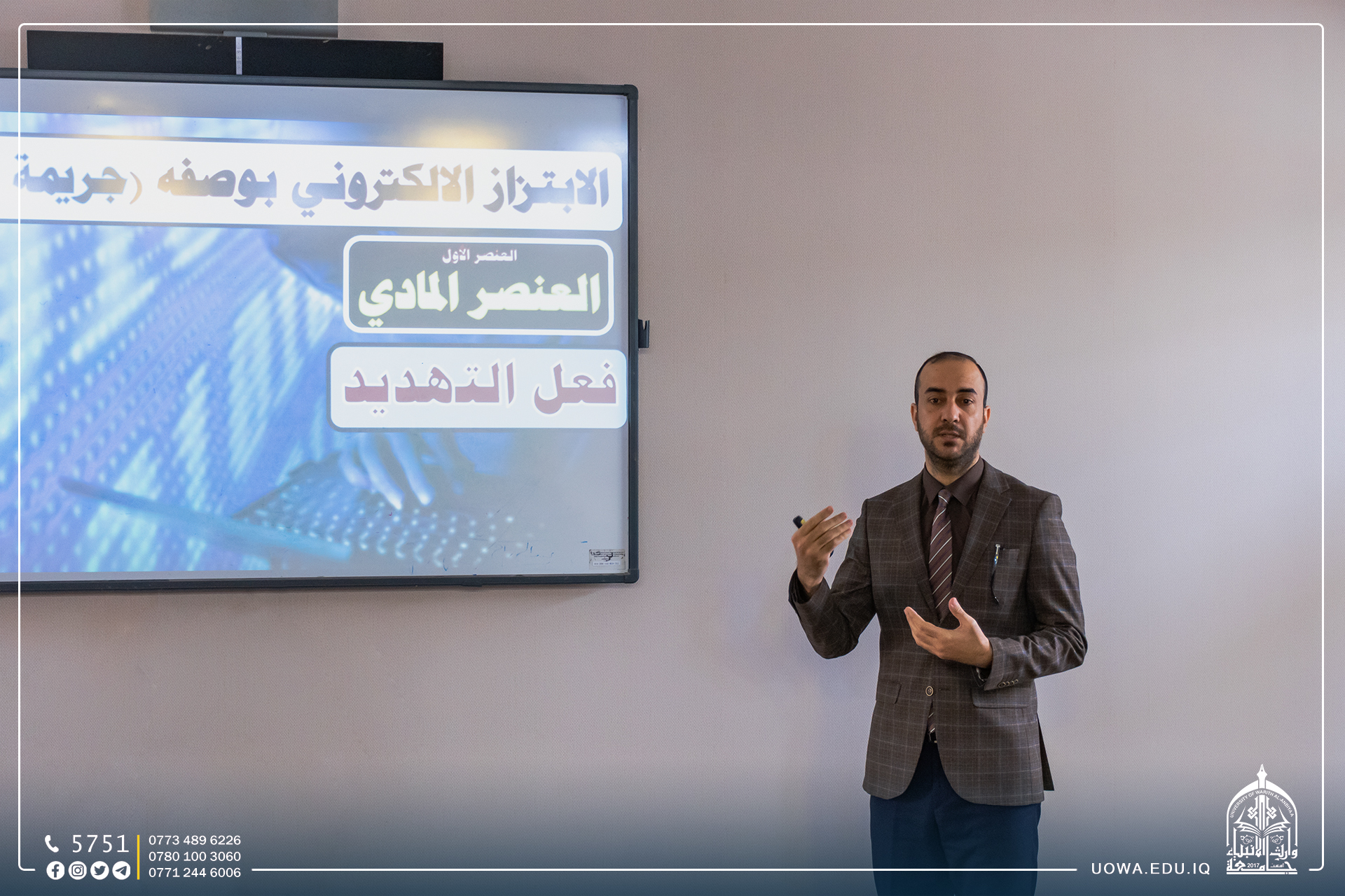 اقامت كلية القانون في جامعة وارث الانبياء (عليه السلام) ندوة علمية تثقيفية بعنوان (كيف نواجه الابتزاز الالكتروني... نفسياً وقانونياً) ألقاها: م.د احمد جابر صالح و م.د حسين محمد صادق