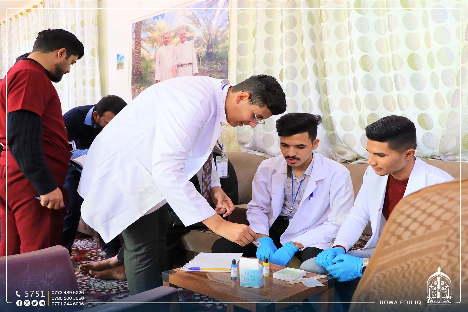 ضمن مبادرة "بركات الانوار المحمدية" التي اطلقتها هيئة الصحة والتعليم الجامعي في العتبة الحسينية المقدسة بمناسبة الولادات الشعبانية المباركة، اقامت كلية الطب بالتعاون مع كلية التمريض في جامعة وارث الانبياء(عليه السلام)، جولة ميدانية للقرى في اطراف محافظة كربلاء المقدسة بإشراف عمادة كلية الطب لتقديم الدعم الطبي لساكني هذه القرى و الاستشارات الطبية لهم.