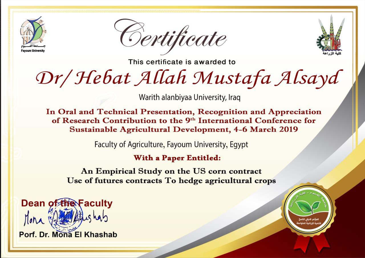 شاركت الدكتورة هبة الله مصطفى السيد علي التدريسية في قسم المحاسبة /كلية الادارة والاقتصاد / جامعة وارث الانبياء في مؤتمر الدولي التاسع للتنمية الزراعية المتواصلة والذي انعقد في جمهورية مصر العربية للمدة من (4-6) اذار /مارس وحصلت الدكتورة هبة الله مصطفى على كتاب شكر وتقدير وشهادة مشاركة من عمادة الكلية / جامعة الفيوم وذلك لمشاركتها المتميزة في القاء بحث بعنوان ((دراسة تطبيقية على عقود الذرة الامريكية باستخدام عقود المستقبليات لتحويط المحاصيل الزراعية))