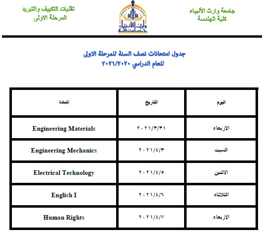 1. تبدأ الامتحانات بتاريخ (20 / 3) للمراحل الثانية والثالثة والرابعة والمرحلة الأولى ستكون بتاريخ (31 / 3) في الساعة 10 صباحاً.