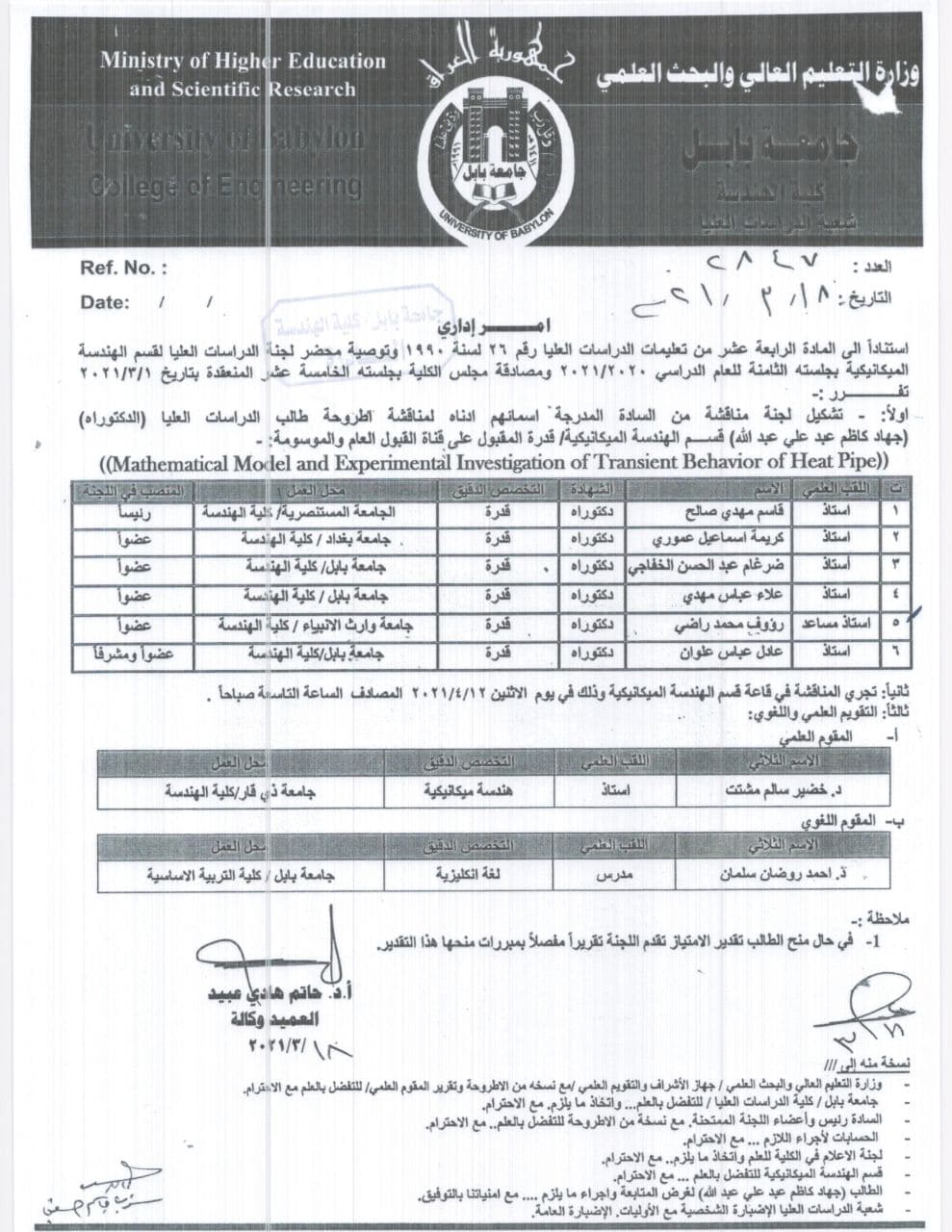 شارك السيد عميد كُلْيَة الهندسة أ.م.د. رؤوف محمد راضي في مناقشة رسالة طالب الدكتوراه جهاد كاظم عبدعلي و الموسومة ب