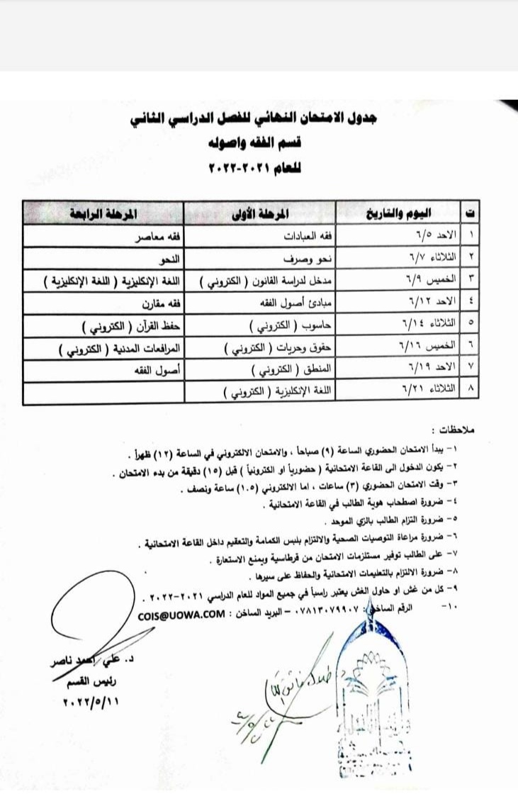 جدول الامتحانات النهائية لقسم الفقه واصوله / الفصل الثاني العام الدراسي 2021 / 2022