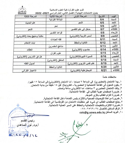 جدول الامتحانات النهائية لقسم علوم القرآن / الفصل الثاني من العام الدراسي 2021 / 2022