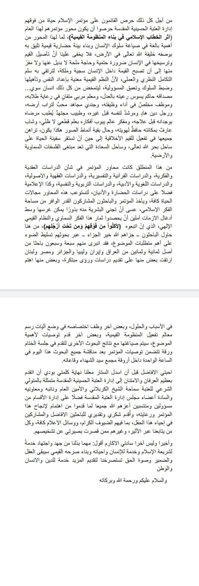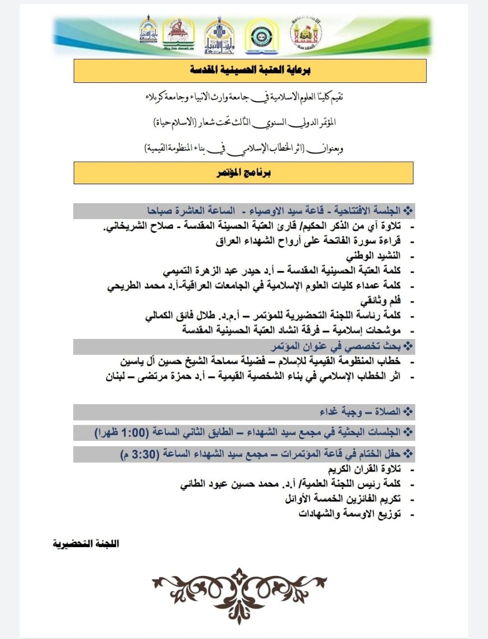 حرصا منها في ترسيخ المبادئ القيمية والأخلاقية التي أوصت بها الشريعة الإسلامية الغراء ولما لها من أثر طيب في بناء مجتمع صالح يزدهر بتراثه وثقافته الإسلامية لا سيما ترسيخ مبدأ الخطاب الإسلامي النابع من صميم الاسلام وتعاليمه رعت الأمانة العامة للعتبة الحسينية المقدسة المؤتمر الدولي السنوي الثالث والذي تقيمه كليتا العلوم الإسلامية في جامعة وارث الأنبياء وجامعة كربلاء تحت شعار الاسلام حياة وتحت عنوان اثر الخطاب الإسلامي في بناء المنظومة القيمية ووفق البرنامج المرفق والذي سيعقد في يوم السبت الموافق ٢٥/١٢/٢٠٢١