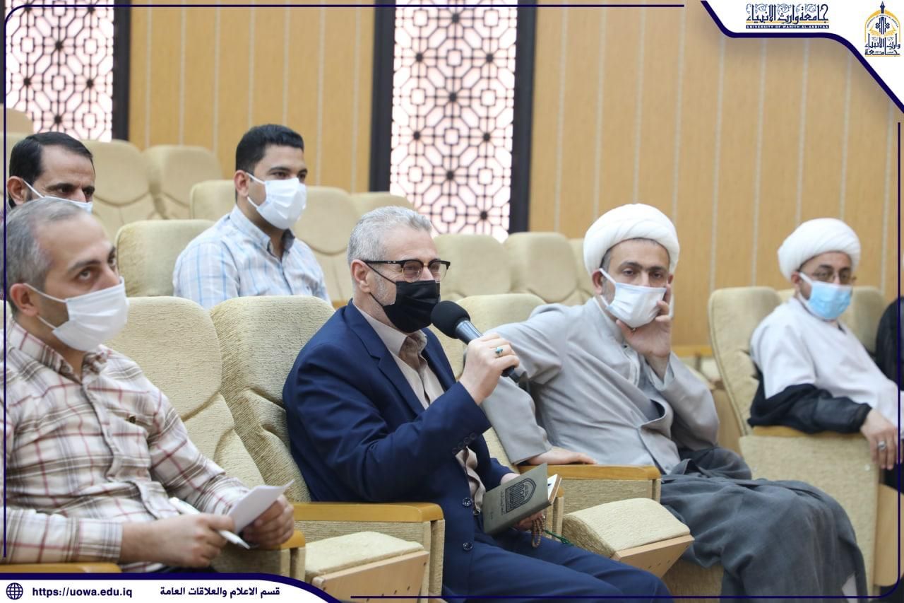 حرصًا من رئيس جامعة وارث الأنبياء "ع" الأستاذ الدكتور (طالب حسن موسى) لسير العملية التعليمية والمحافظة على مكانة الجامعة العلمية ومتابعة الأداء التعليمي لكوادرها التدريسية والنظر في مستقبل طلبتنا في المحافظة على جوهرهم العلمي في عدم الانسياق وراء الطرح الفكري غير المدروس والفاقد للبعد العلمي والخالي من رؤية المستقبل والتطلعات والتوجهات البناءة، التقى رئيس الجامعة ومساعديه الإداري الأستاذ الدكتور (نوفل الأعرجي) والأستاذ الدكتور (عباس الدعمي) بكلية العلوم الإسلامية بعمادتها ورئيسي قسميها والملاك التدريسي فيها، في يوم الاثنين الموافق 26/ 4/ 2021، في (قاعة العلى). باجتماع نستطيع تسميته بـ ( لقاء الحرص والاهتمام في النظر إلى مصلحة الجامعة وأساتيذها وطلابها).