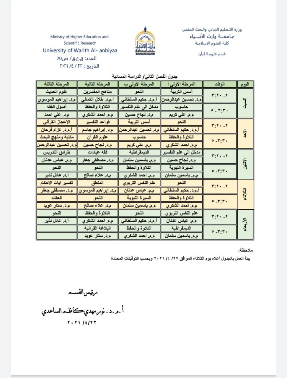 جدول الدروس الأسبوعي لقسم علوم القرآن / للمراحل الثلاث / الدراسة المسائية