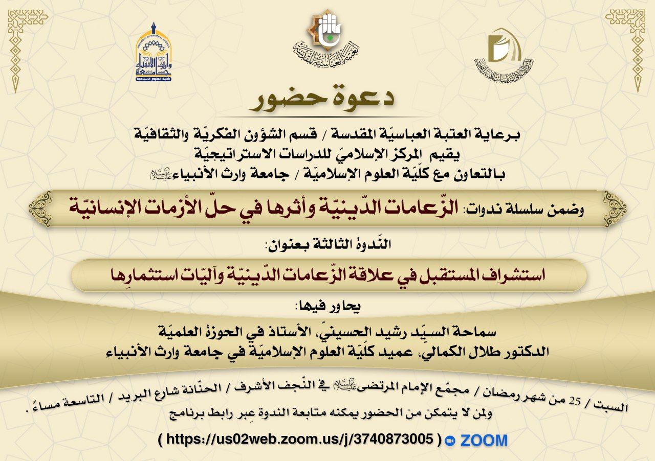 دعوة حضور...برعاية العتبة العباسيّة المقدسةقسم الشؤون الفكريّة والثقافيّةيقيم المركز الإسلاميّ للدراسات الاستراتيجيّةبالتعاون مع كلّيّة العلوم الإسلاميّة / جامعة وارث الأنبياء (ع)وضمن سلسلة ندوات الزّعامات الدّينيّة وأثرها في حلِّ الأزمات الإنسانيّةالندوة الثالثة بعنوان : استشراف المستقبل في علاقة الزّعامات الدّينيّة وآليّات استثمارِهايحاور فيها :* سماحة السـيد رشيد الحسينيّ ، الأستاذ في الحوزة العلميّة* الدكتور طلال الكماليّ ، عميد كلّيّة العلوم الإسلاميّة في جامعة وارث الأنبياء