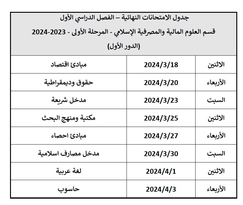 جدول الامتحانات النهائية للفصل الاول من العام الدراسي 2023-2024 قسم العلوم المالية والمصرفية الإسلامي - المرحلة الأولى
