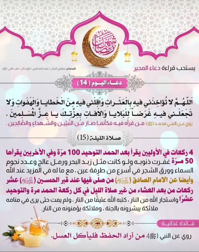 دعاء اليوم الرابع عشر من شهر رممضان وصلاة اليلة الخامسة عشر من الشهر الكريم