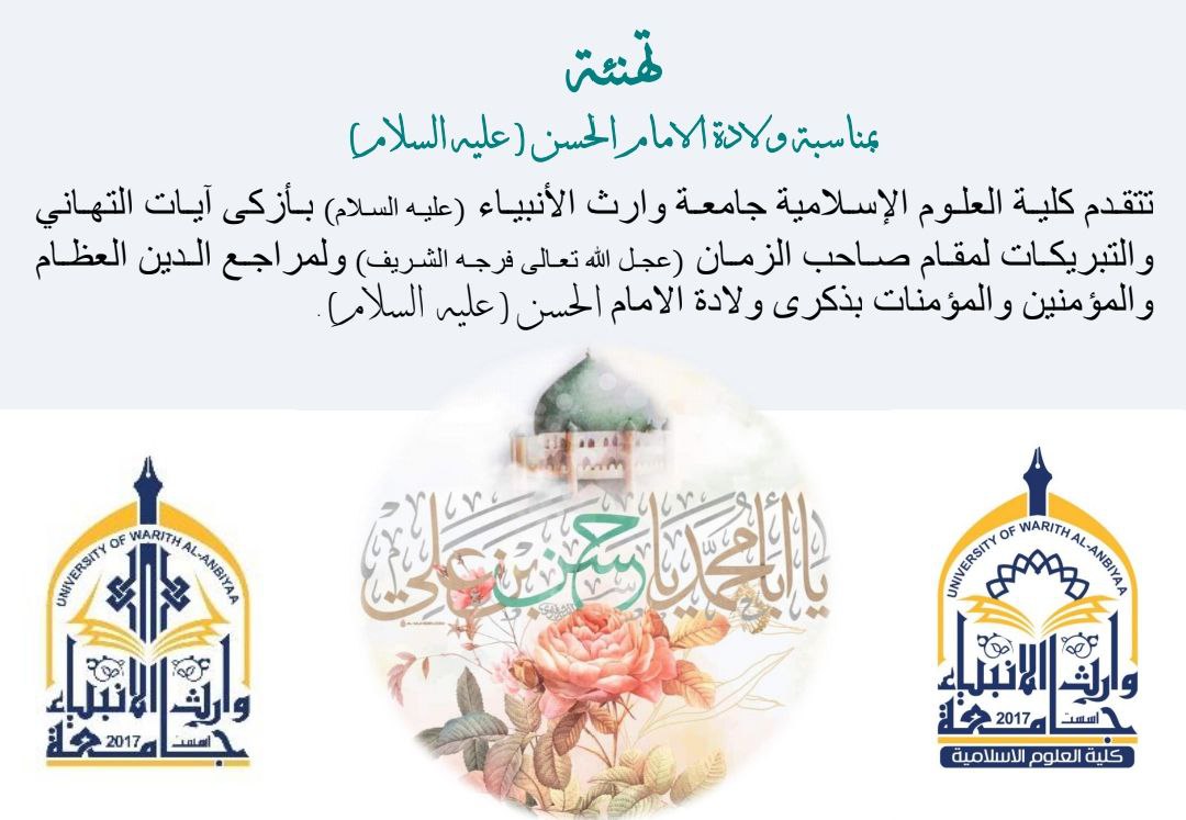 تتقدم كلية العلوم الإسلامية جامعة وارث الأنبياء (علية السلام) بأزكى آيات التهاني والتبريكات لمقام صاحب الزمان (عجل الله تعالى فرجه الشريف)