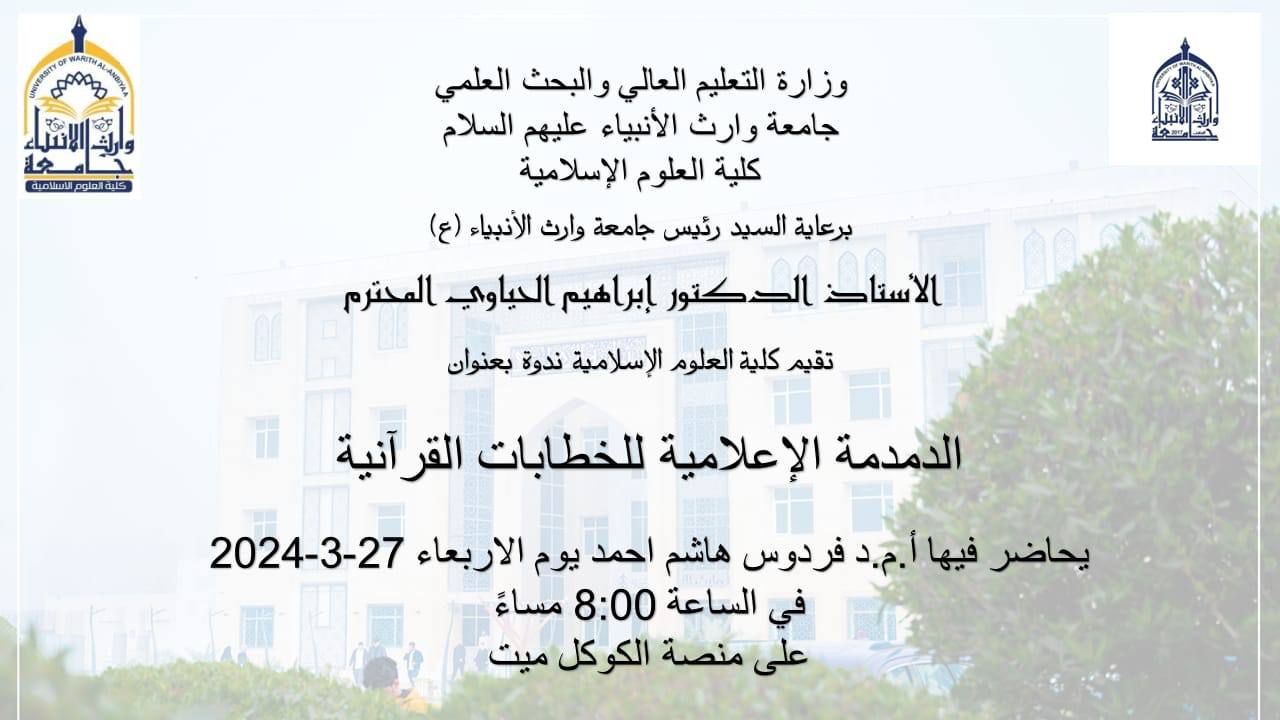 أقامت كلية العلوم الإسلامية في جامعة وارث الأنبياء عليهم السلام ندوة علمية بعنوان "الدمدمة الإعلامية للخطابات القرآنية"، حيث كانت الندوة من تقديم وتحليل أ.م.د. فردوس هاشم أحمد، وذلك يوم الأربعاء الموافق 27 مارس 2024 في تمام الساعة الثامنة مساءً على منصة كوكل ميت.