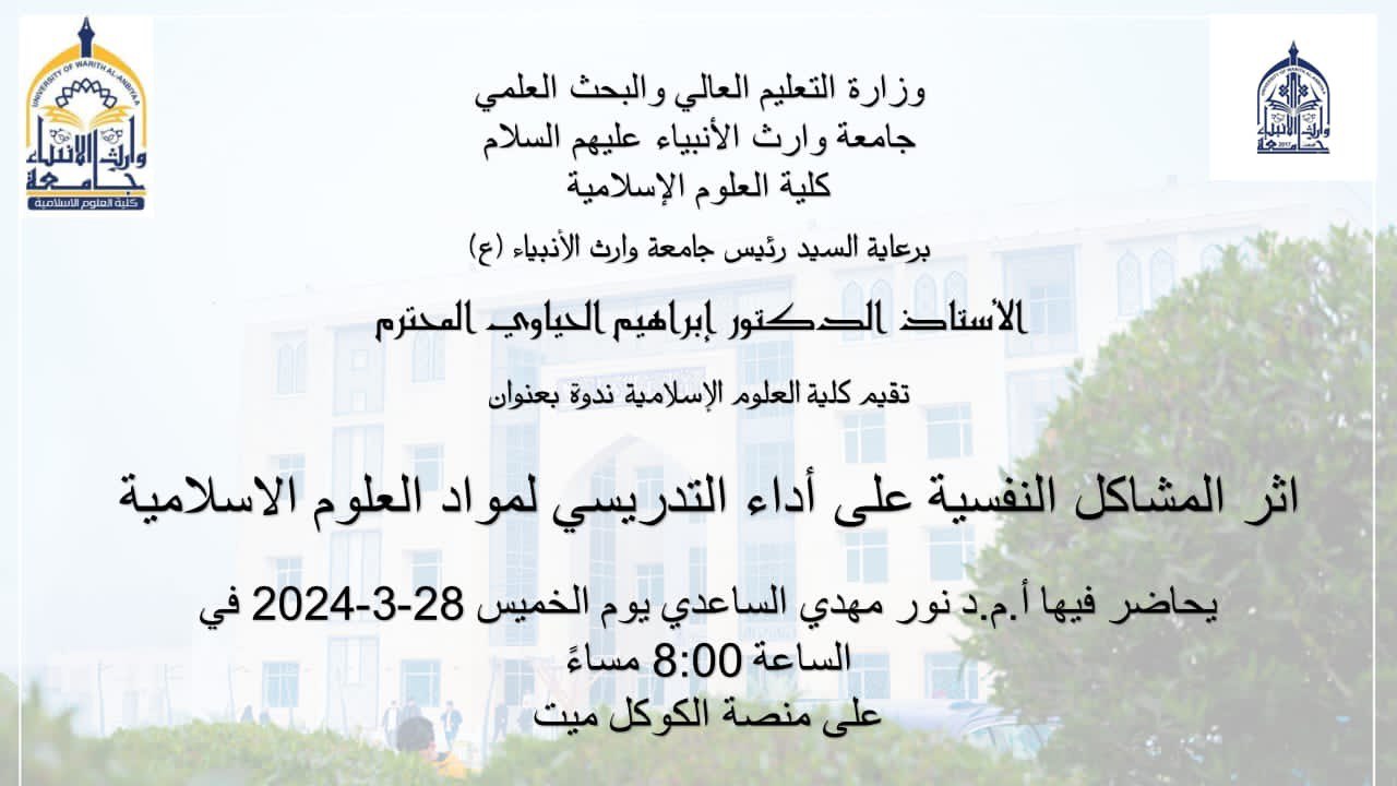أُقيمت ندوة علمية مهمة في كلية العلوم الإسلامية في جامعة وارث الأنبياء عليهم السلام، تحت عنوان "أثر المشاكل النفسية على أداء التدريسي لمواد العلوم الإسلامية". وقدمت هذه الندوة أ.م.د. نور مهدي الساعدي، وذلك يوم الخميس الموافق 28 مارس 2024 في تمام الساعة الثامنة مساءً على منصة كوكل ميت.