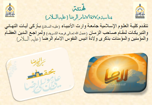 تتقدم كلية العلوم الإسلامية جامعة وارث الأنبياء (عليه السلام) بأزكى آيات التهاني والتبريكات لمقام صاحب الزمان (عجل الله تعالى فرجه الشريف) ولمراجع الدين العظام والمؤمنين والمؤمنات بذكرى ولادة انيس النفوس الامام الرضا ( عليه  السلام) .