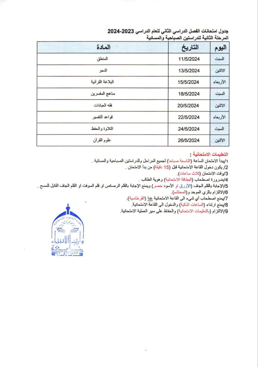 نرفق لكم جدول الامتحانات النهائية للفصل الثاني من العام الدراسي 2023-2024 و للمرحلة الثانية والثالثة  مع التعليمات الامتحانية متمنين لكم دوام التوفيق و النجاح.