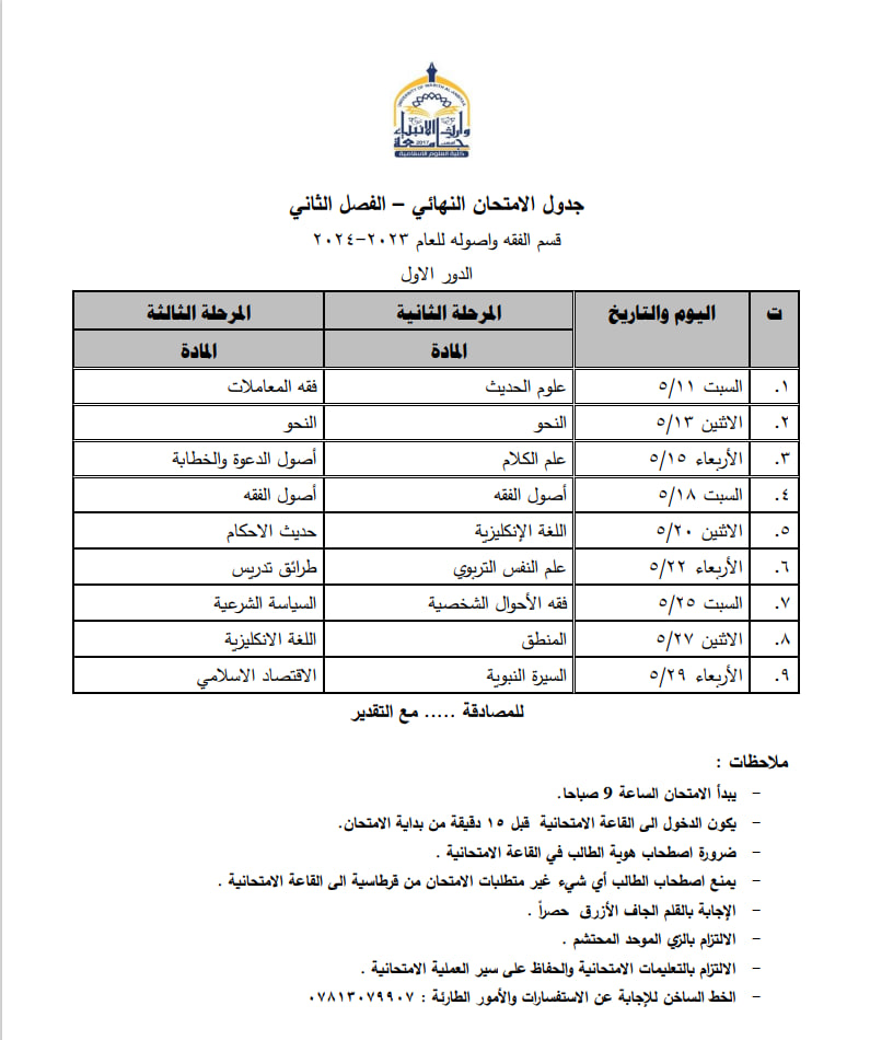 طلبتنا الاعزاء في قسم الفقه وأصوله .. نرفق لكم جدول الامتحانات النهائية للفصل الاول من العام الدراسي 2023-2024 و للمرحلة الأولى مع التعليمات الامتحانية متمنين لكم دوام التوفيق و النجاح.