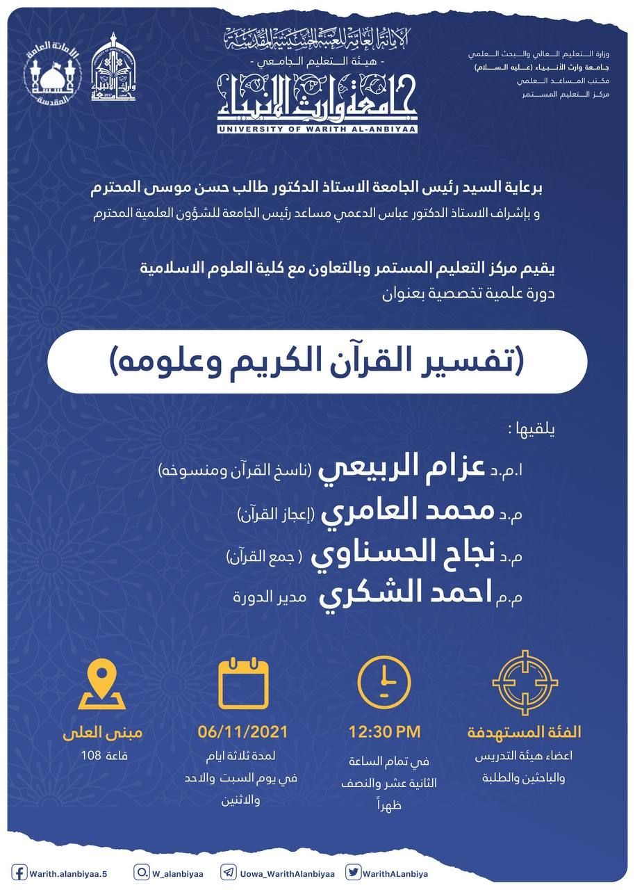 ختام الدورة العلمية الموسومة ب (  تفسير القرآن الكريم وعلومه) التي أقامها مركز التعليم المستمر في جامعة وارث الانبياء بالتعاون مع كلية العلوم الإسلامية