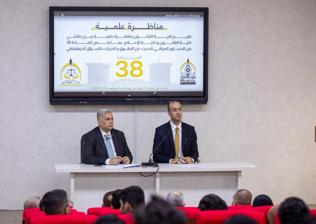 شارك التدريسي م.م حازم ناظم الشباني في المناظرة العلمية بين طلبيت كلية الاعلام وكلية القانون التي اقامتها كلية الاعلام بالتعاون مع كلية القانون فيما يخص المادة 38 من الدستور العراقي للحديث عن الحقوق والحريات بالسياق الديمقراطي .