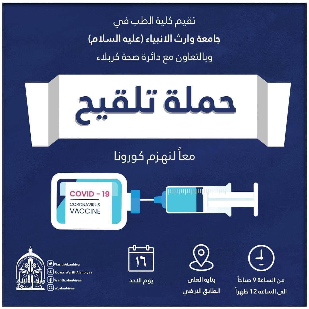 تستمر حملة التلقيح التي تقيمها كلية الطب وبالتعاون مع دائرة صحة كربلاء المقدسة كل يوم احد ،للحد من إنتشار فايروس كورونا .