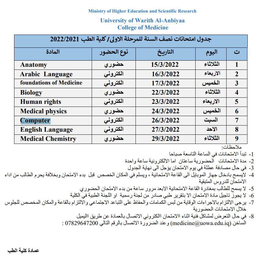 تم على بركة الله اليوم الأول من الامتحانات الالكترونية لكلية الطب جامعة وارث الأنبياء لنصف السنة للعام الدراسي 2021-2022 و بأشراف السيد معاون العميد الدكتور اسعد عباس المحترم .