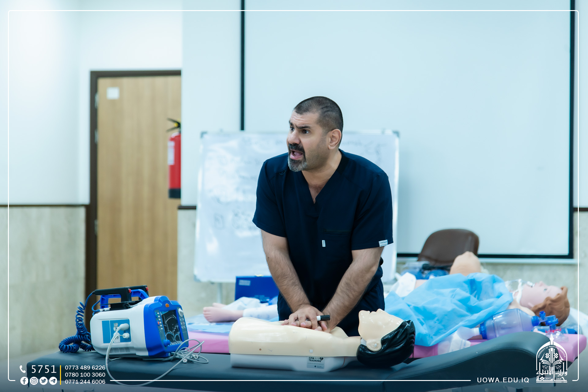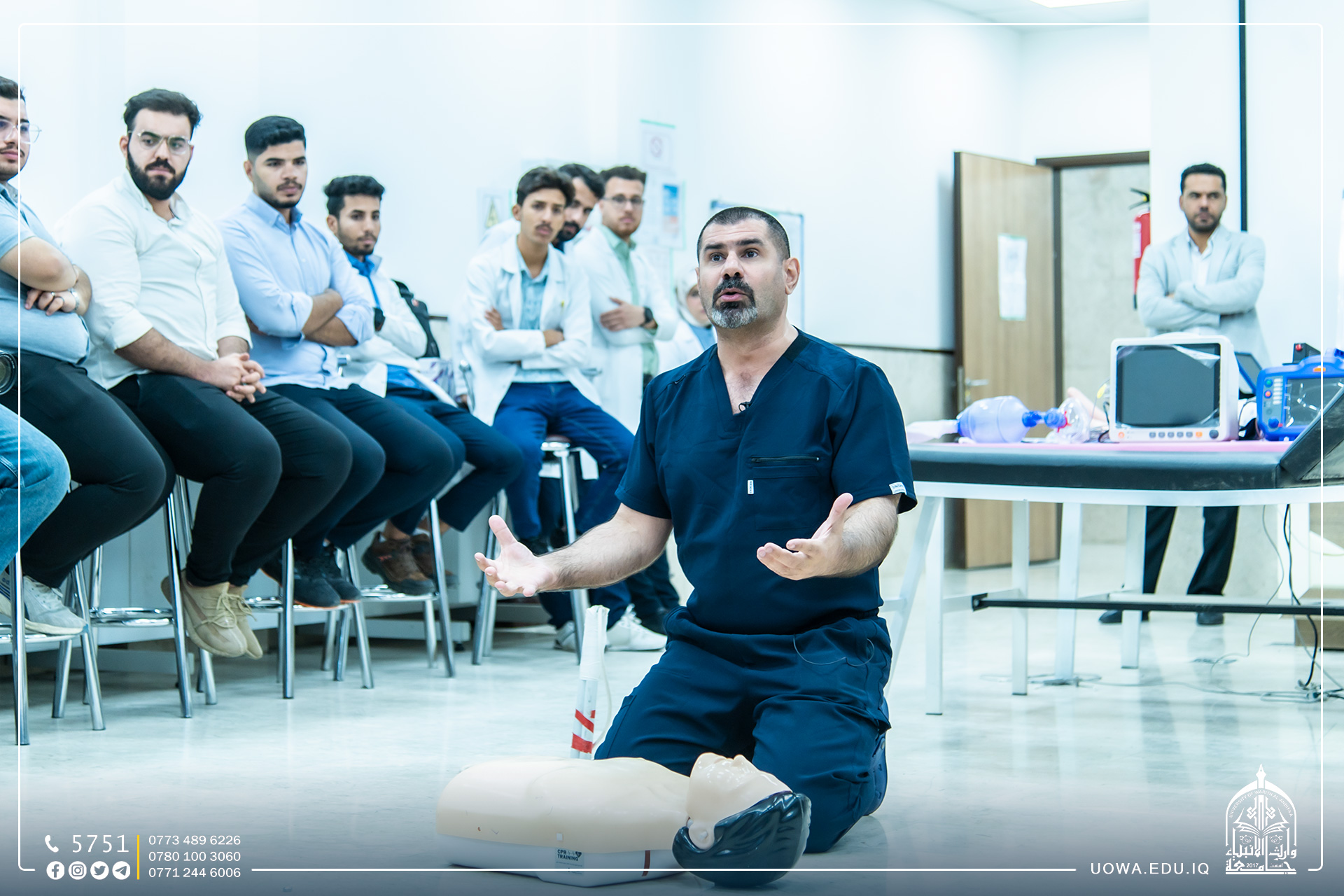 بحضور سماحة المتولي الشرعي للعتبة الحسينية المقدسة الشيخ عبد المهدي الكربلائي (دام عزه) والسيد رئيس الجامعة الاستاذ الدكتور ابراهيم الحياوي، أقامت كلية الطب وبإشراف هيئة الصحة والتعليم الطبي في العتبة الحسينية المقدسة، ورشة عمل لطلبة الكلية بعنوان (أساسيات انقاذ الحياة) ضمن المتطلبات العلمية لتطوير مهارات طلبة كلية الطب عبر الاستعانة بمدربين من أكاديمية طب الحشود والطوارئ.واطلع سماحته على الدورة التدريبية الأولى في دعم انقاذ الحياة الاساسية (Basic life support )لطلبة المرحلة الثانية في كلية الطب ضمن برنامج تدريب المهارات الاجرائية في مركز المحاكاة الخاص بمستشفى الامام زين العابدين (ع )من قبل مدربي أكاديمية طب الحشود والطوارئ.وتضمن البرنامج التعليمي والتدريبي لطلبة الكلية ثلاثين مهارة يتعلمها الطالب لدرجة التمكن التام وحسب المعايير العالمية.