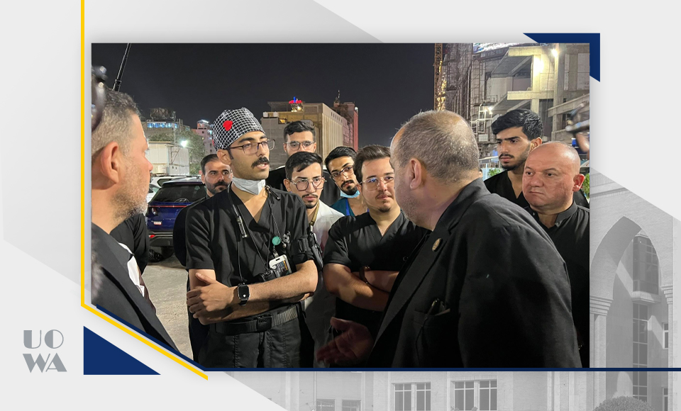 ‏‎وشملت الجولة الاطلاع على سير عمل المفارز الميدانية التي يشارك فيها طلبة كلية الطب، والوقوف على جاهزيتها في التعامل مع الحالات الطارئة وتقديم الإسعافات الأولية، بما يعكس جانباً من التدريب العملي الميداني الذي تحرص عليه الجامعة لطلبتها