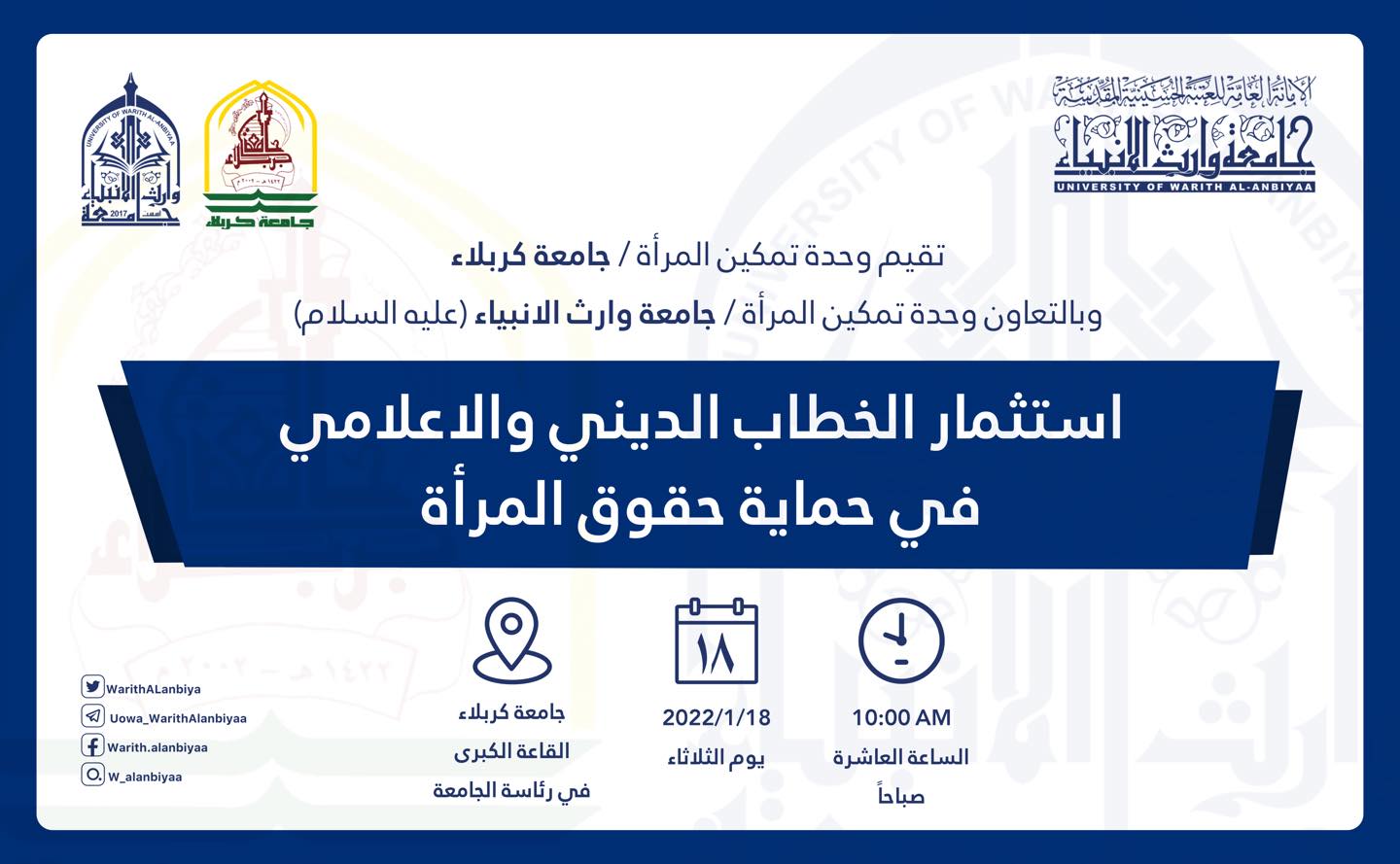 تقيم وحدة تمكين المرأة في جامعة كربلاء وبالتعاون مع وحدة تمكين المرأة بجامعة وارث الانبياء (عليه السلام)، اليوم الثلاثاء 18-1-2022 ندوة بعنوان (استثمار الخطاب الديني والإعلامي في حماية حقوق المرأة)، وذلك في تمام العاشرة صباحاً على القاعة الكبرى في رئاسة الجامعة.