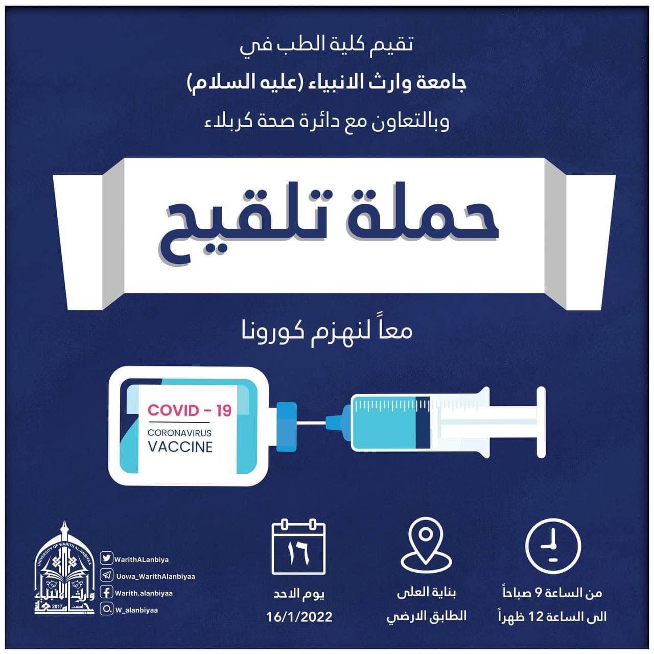 تستمر حملة التلقيح التي تقيمها كلية الطب وبالتعاون مع دائرة صحة كربلاء المقدسة حتى يوم الاحد القادم المصادف 23/1/2022 ،للحد من إنتشار فايروس كورونا سائلين الله (عزوجل) ان يرزقنا وإياكم دوام الصحة والعافية