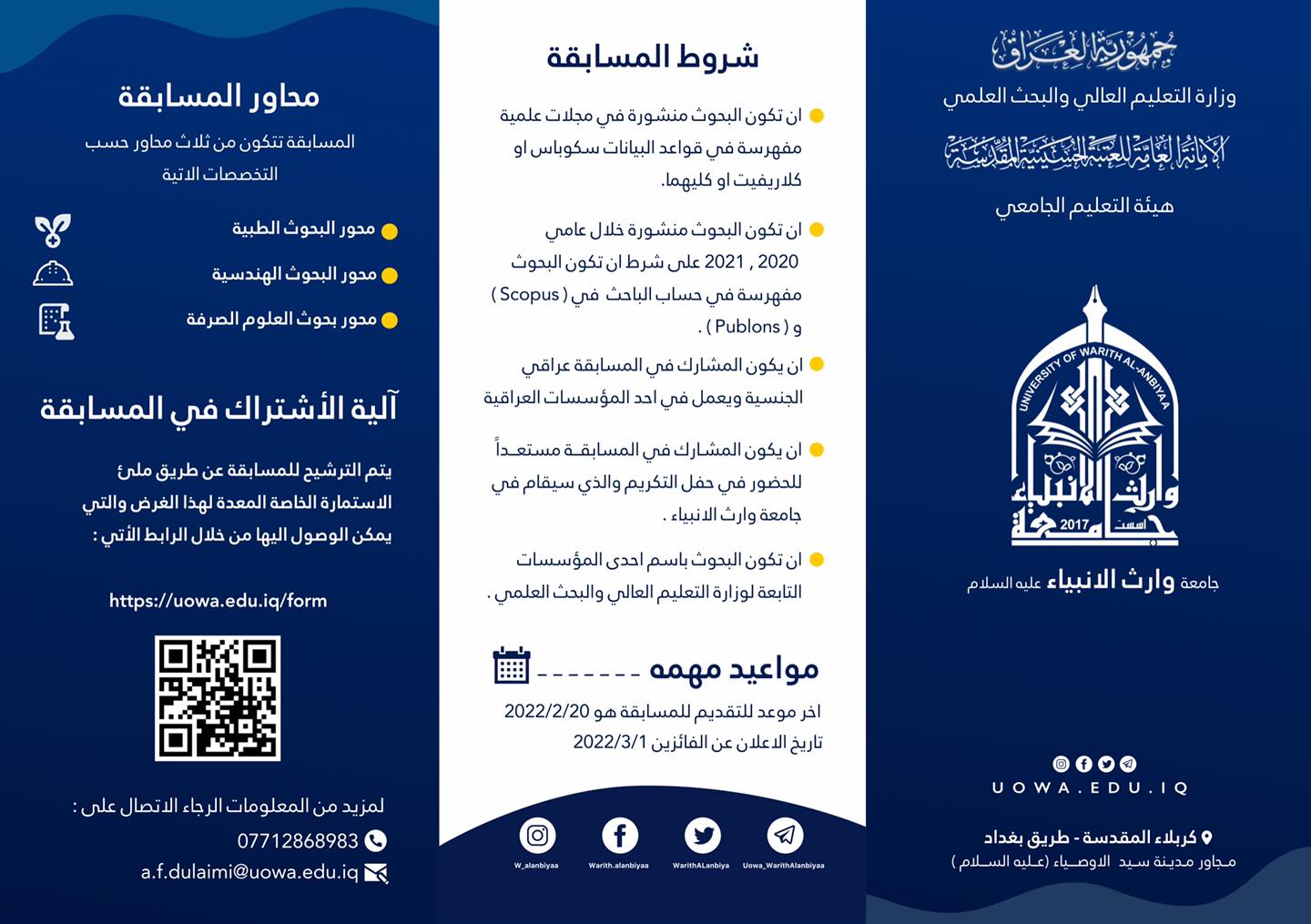 *الارتقاء بالمستوى النوعي لمخرجات البحث العلمي في الجامعات العراقية.*التعرف على القضايا والاهتمامات البحثية المشتركة للباحثين في مختلف الجامعات والمؤسسات الاكاديمية.*تشجيع الباحثين على النشر في المجلات العلمية الرصينة المفهرسة ضمن قواعد البيانات العالمية.- إيماناً منها بأهمية البحث العلمي الرصين فقد قررت الجامعة الجوائز التالية ولكل محور:* الجائزة الأولى: 3 مليون دينار*الجائزة الثانية: 2 مليون دينار*الجائزة الثالثة: 1 مليون دينار-إضافة الى شهادة تميز شرفية وتقديرية وجوائز للفائزين من التسلسل الرابع ولغاية العاشر ولكل محور من محاور المسابقة.-رابط الاشتراك في كروب مسابقة وارث الأنبياء للتميز البحثي الأولى:* https://t.me/+HH3KRAc4CyphYzU8-رابط التقديم على المسابقة:* https://uowa.edu.iq/form