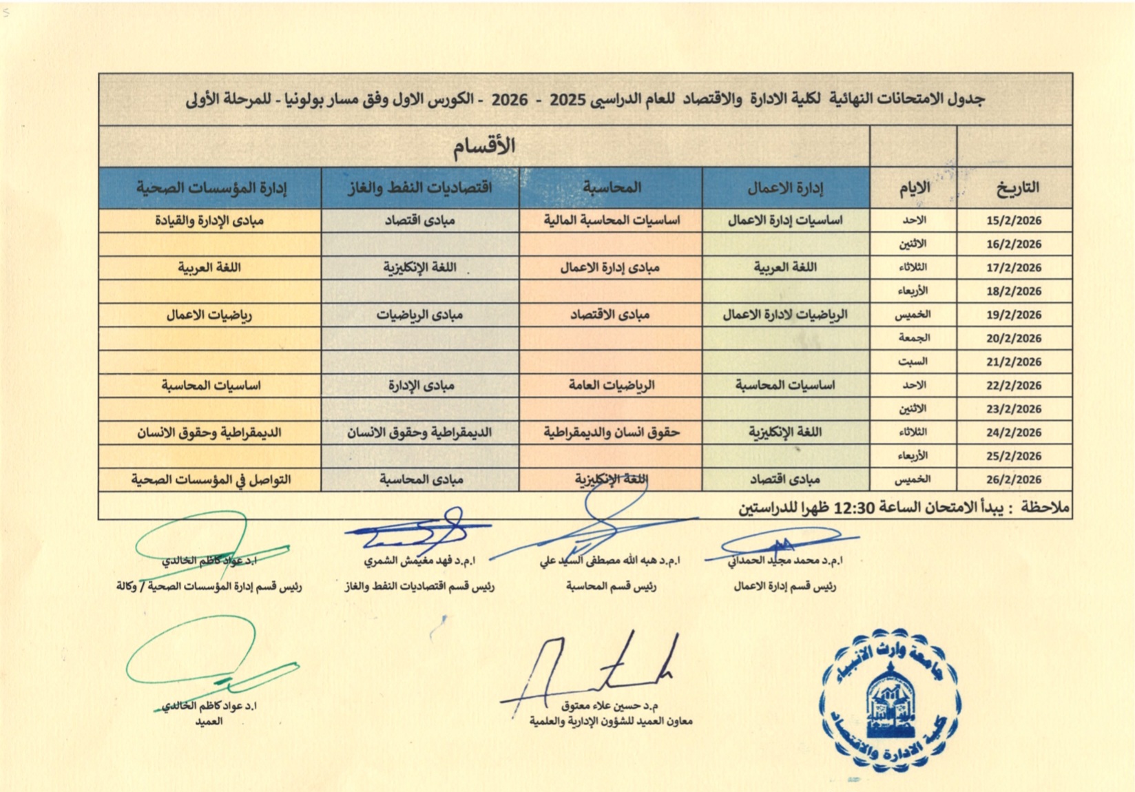 استمرار اداء الامتحانات الحضورية لطلبة كلية الادارة والاقتصاد بقسميها المحاسبة وادارة الاعمال، وبإشراف السيد عميد الكلية الاستاذ الدكتور عواد الخالدي.