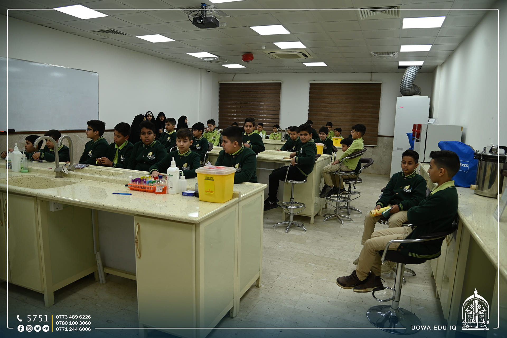 استقبلت جامعة وارث الأنبياء (عليه السلام) عدد من طلبة مرحلة الخامس الابتدائي في مدرسة الق الوارث الابتدائية التابعة للعتبة الحسينية المقدسة، وتجول الطلبة في أروقة الجامعة وكلية التمريض واطلعوا على المختبرات العلمية فيها، وتم تقديم شرح مختصر عن مختبر الكيمياء والتشريح، إذ تساهم هذه الرحلات في تنمية مهارات الطلبة، وفي نهاية السفرة خط الطلبة رسائل شكر الى الجامعة بأناملهم اليافعة، عبروا من خلالها عن التفاصيل الجميل التي شاهدوها في الجامعة بأنامل بريئة .