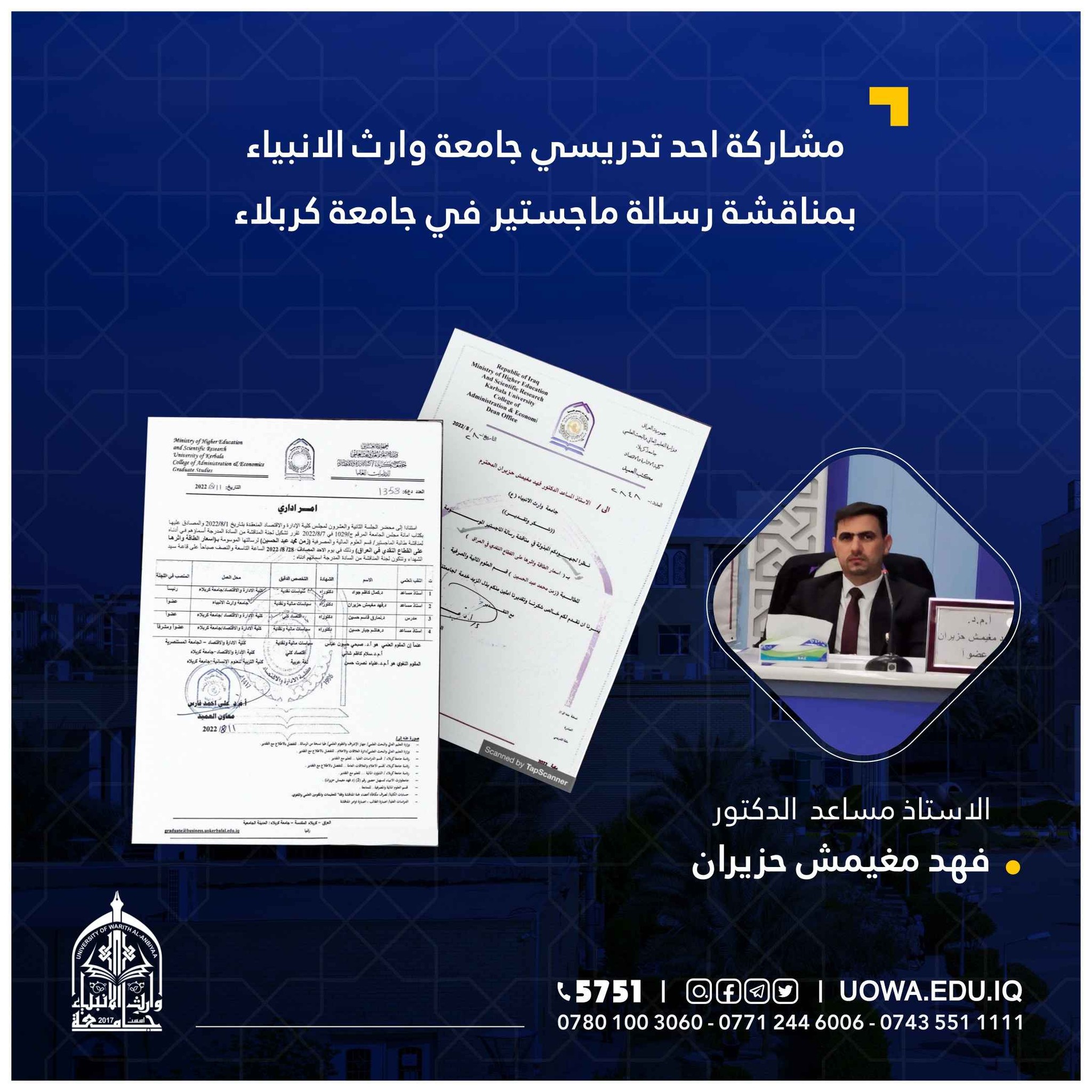 اختير الاستاذ المساعد الدكتور فهد مغيمش الشمري معاون عميد كلية الادارة والاقتصاد عضوا لمناقشة رسالة ماجستير لأحد طلبة الدراسات العليا في جامعة كربلاء.