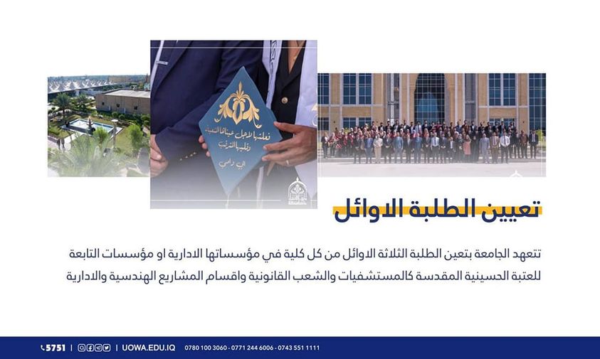 بتوجيه من المتولي الشرعي للعتبة الحسينية المقدسة سماحة الشيخ عبد المهدي الكربلائي (دام عزه)، رئاسة جامعة وارث الانبياء(عليه السلام) تعين طلبتها الثلاثة الاوائل على كليات واقسام الجامعة اعتزازا بطلبتنا الاعزاء الذين اجتهدوا في طلب العلم خلال السنوات الماضية.
