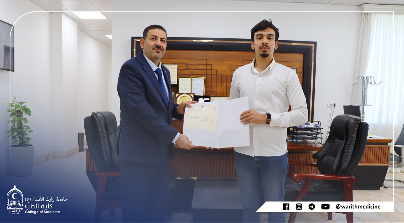 The Dean of the College of Medicine at Warith Al-Anbiya University (PBUH), Professor Dr. Ali Abdul Saadoun Al-Ghazi, honored student Jaafar Ibrahim Dakhil Matar, presenting him with a letter of thanks and appreciation from the University President, Professor Dr. Ibrahim Saeed Al-Hayawi, in addition to a financial reward in recognition of his distinguished scientific efforts. This honor came after the student sent an official letter to the international publishing house, Walters Kluwer, regarding a precise scientific observation in the book *Lippincott’s Illustrated Reviews: Pharmacology – 8th Edition*, concerning the description of MAOIs on pages 141 and 185.