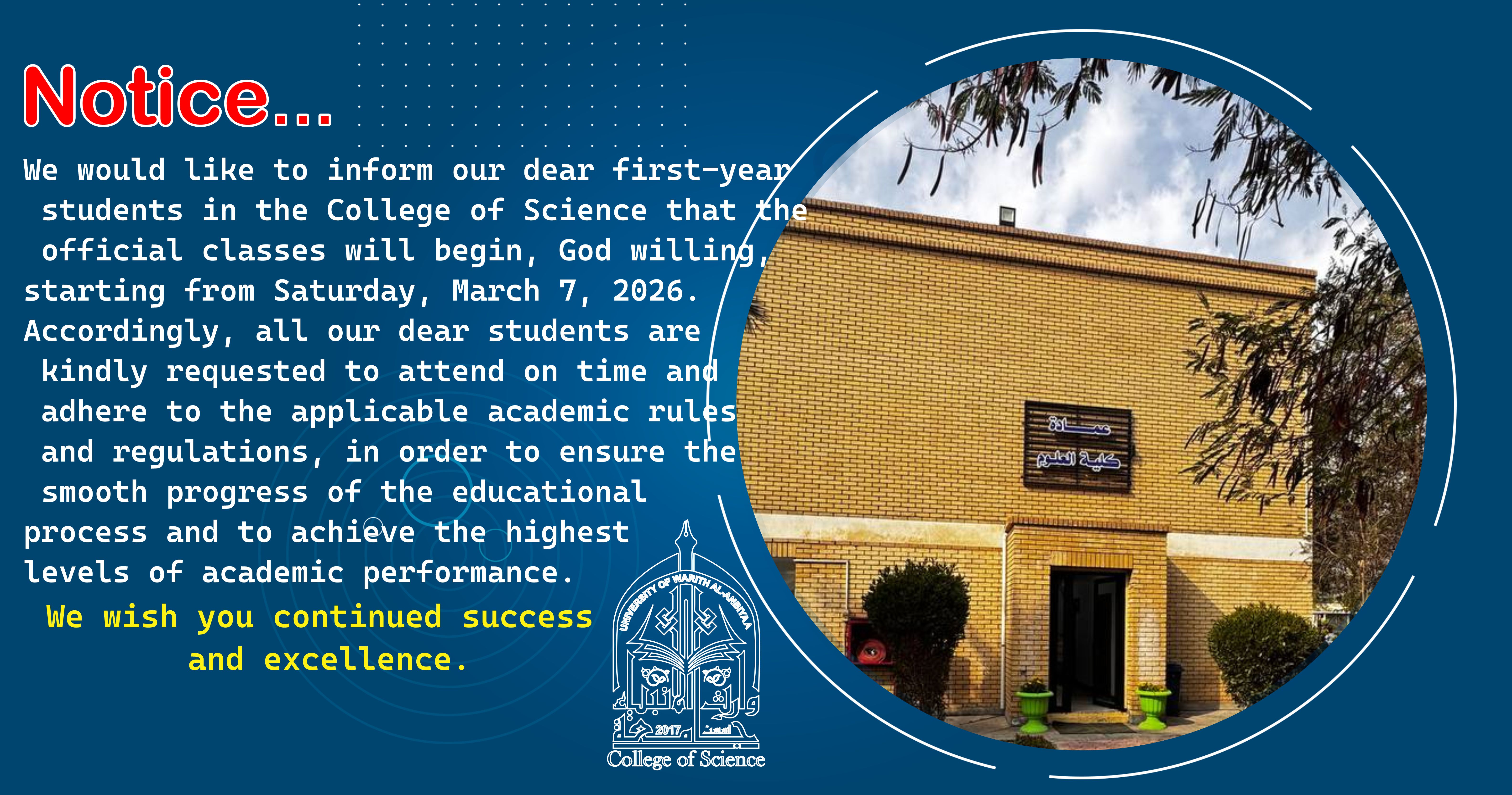 We would like to inform our dear first-year students in the College of Science that the official classes will begin, God willing, starting from Saturday, March 7, 2026.