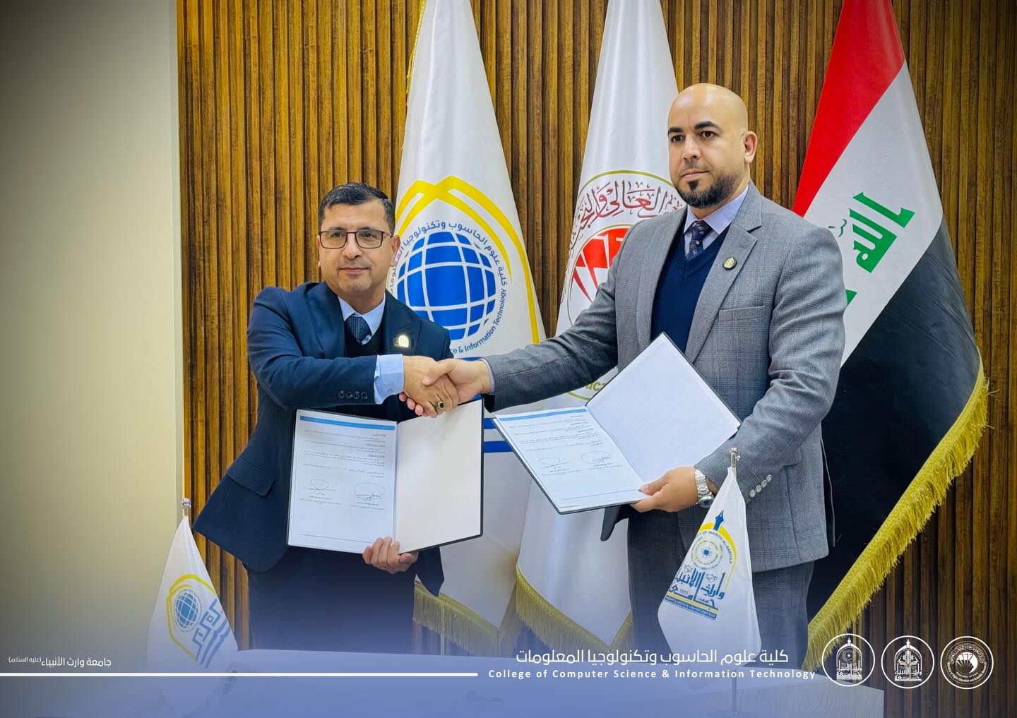 As part of strengthening academic cooperation and exchanging scientific expertise, Assistant Professor Dr. Haider Mohammed Ali Al-Ghanami, Dean of the College of Computer Science and Information Technology at Warith Al-Anbiyaa University (peace be upon him), signed a scientific twinning agreement with Assistant Professor Dr. Mowaffaq Kazem Al-Hasnawi, Dean of the College of Computer Science and Information Technology at the University of Karbala.